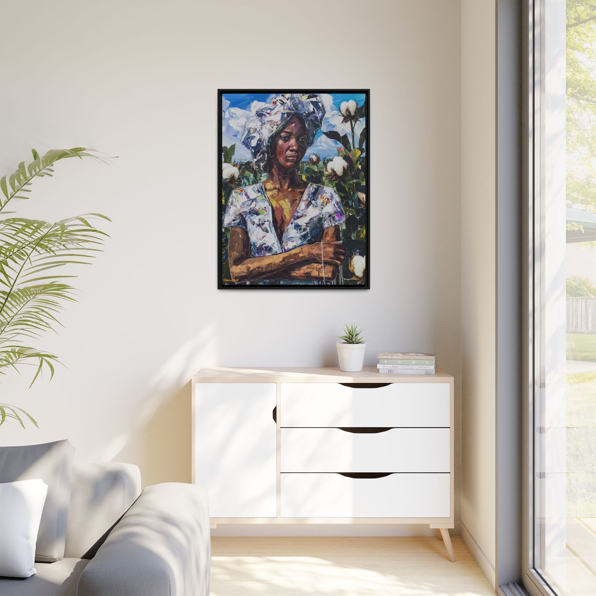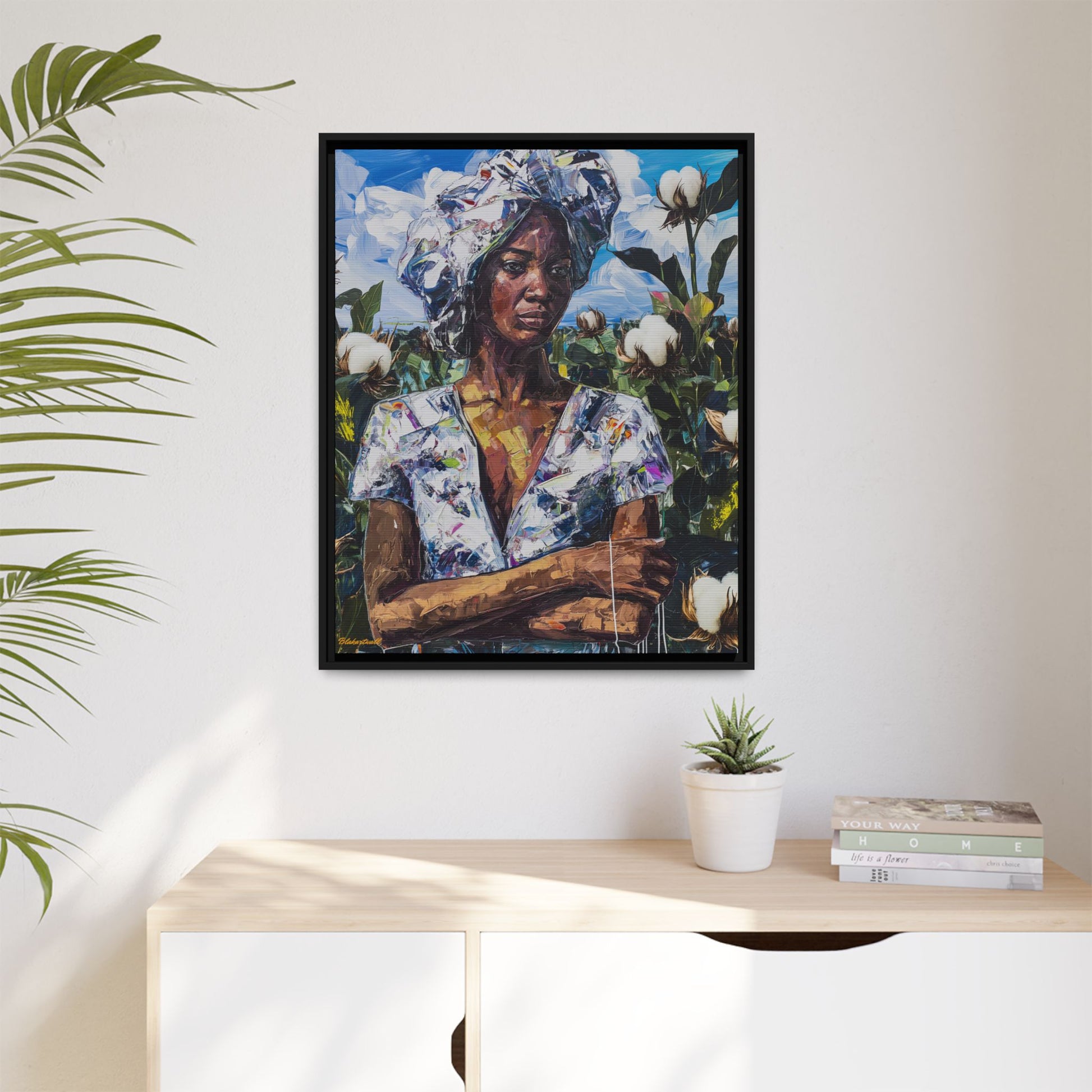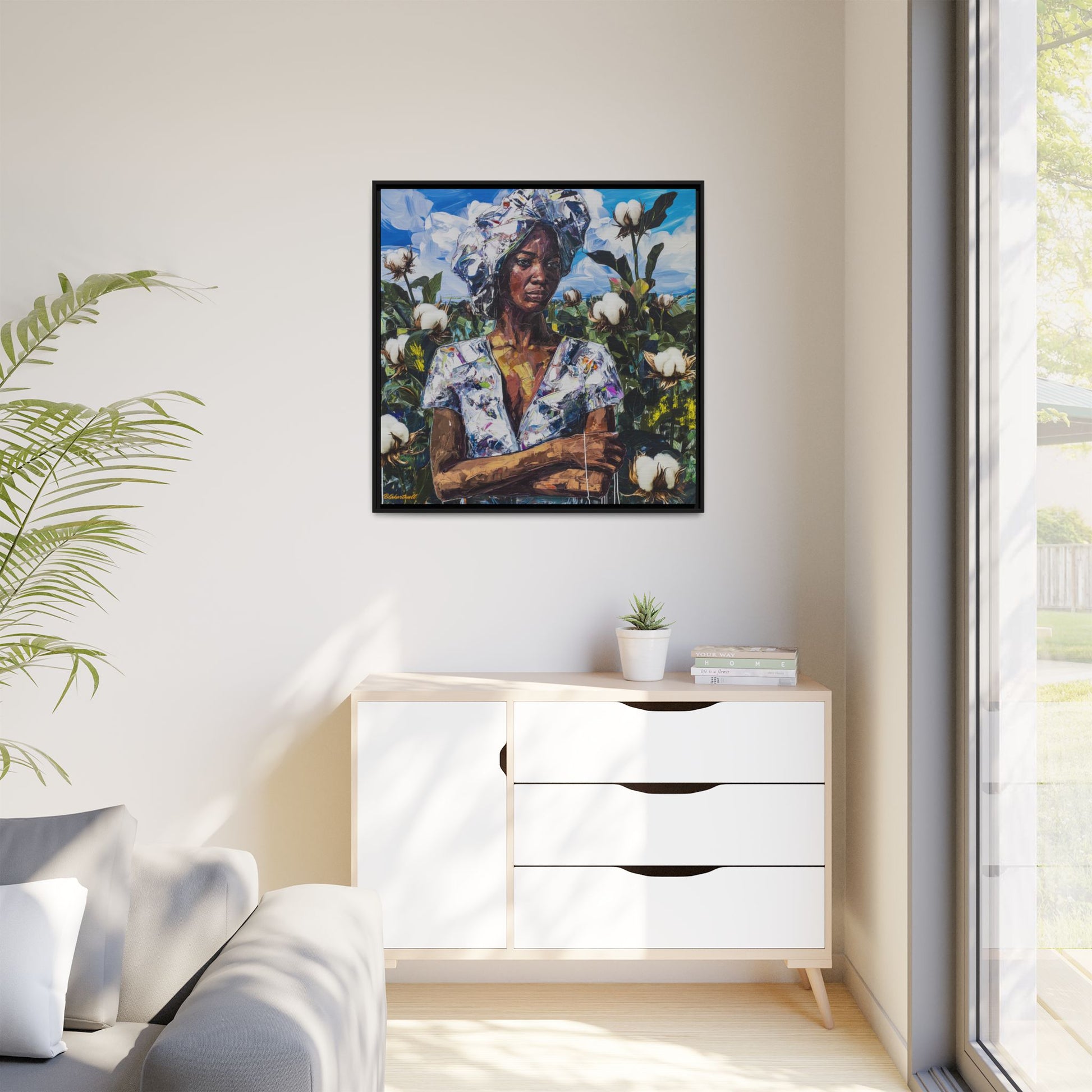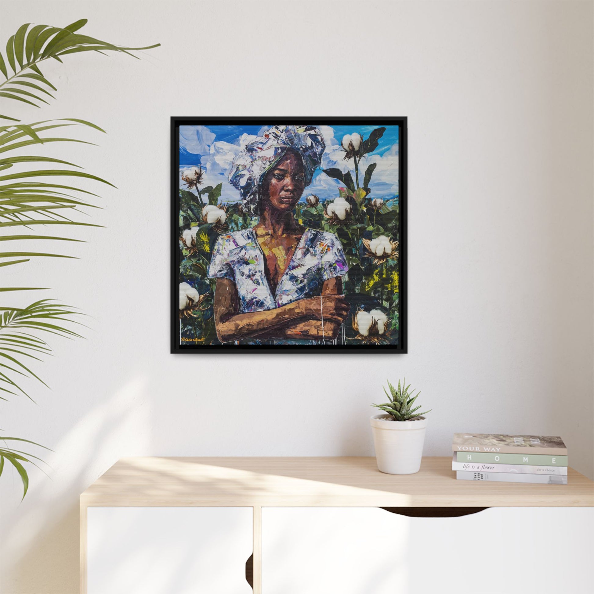COTTON BLOOM: RESILIENCE IN NATURE. It features a woman amidst cotton plants, symbolizing growth, natural beauty, and the enduring strength found both in nature and the human spirit, particularly resonant with themes of African heritage and femininity.