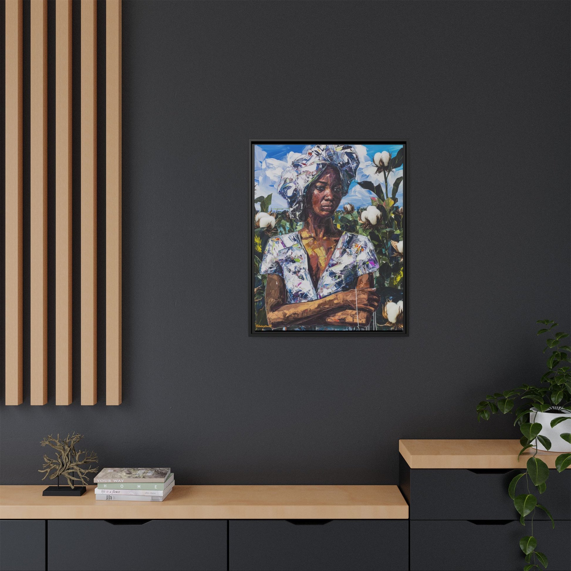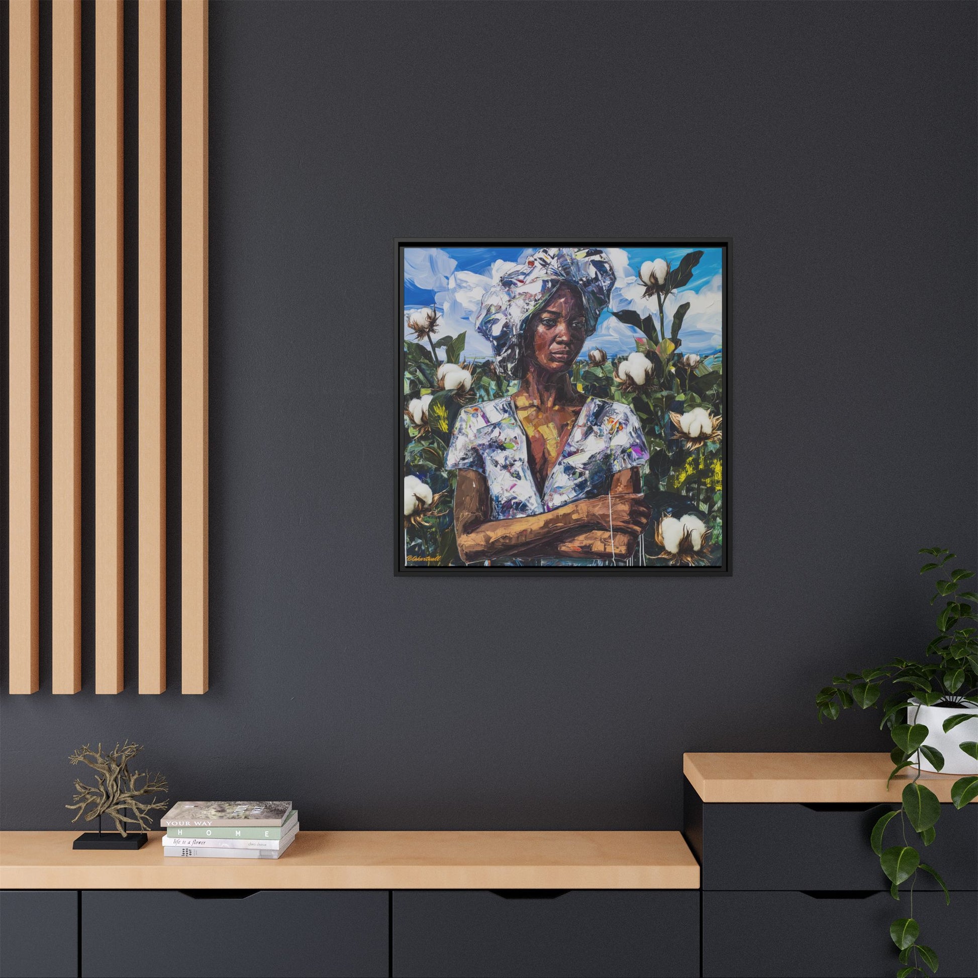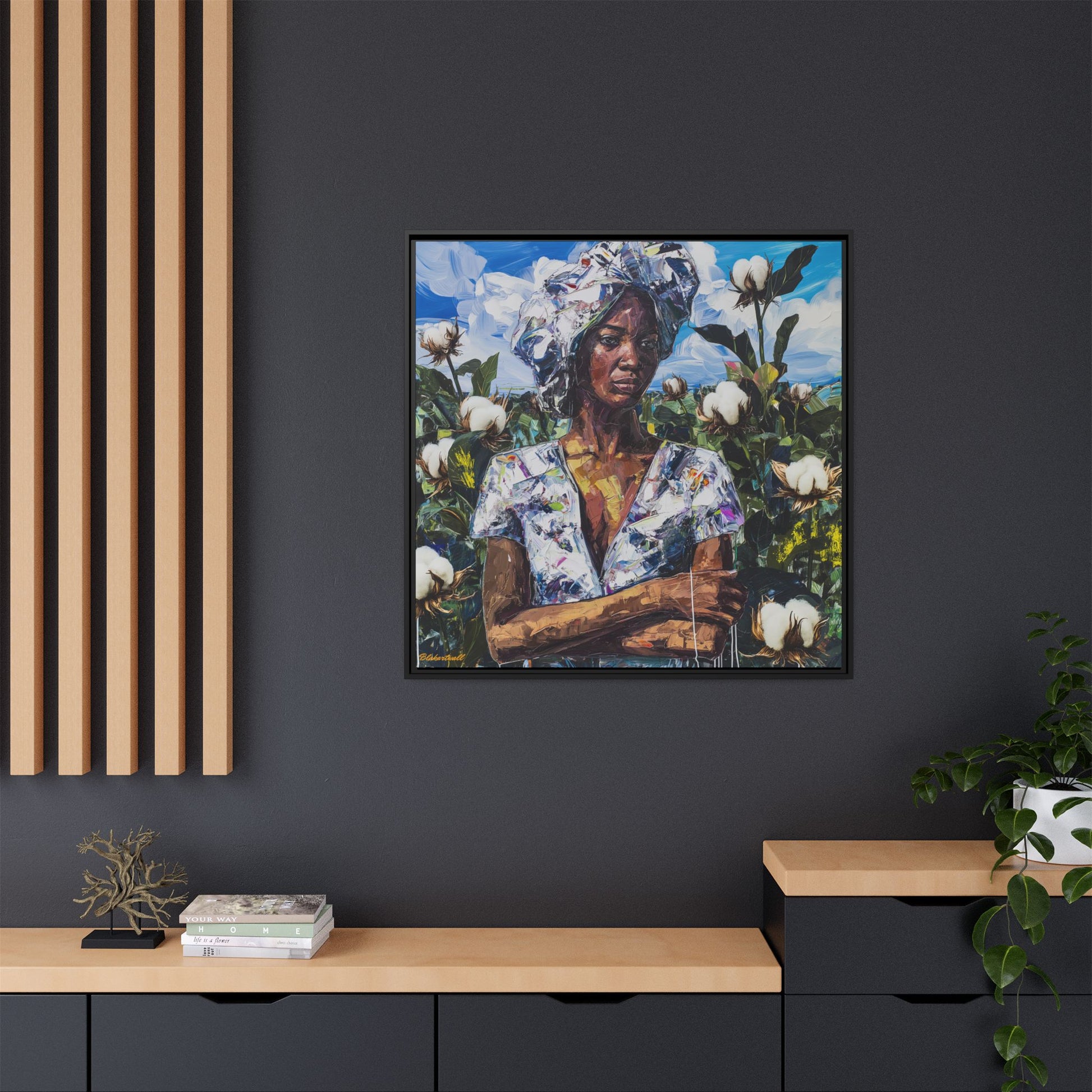COTTON BLOOM: RESILIENCE IN NATURE. It features a woman amidst cotton plants, symbolizing growth, natural beauty, and the enduring strength found both in nature and the human spirit, particularly resonant with themes of African heritage and femininity.