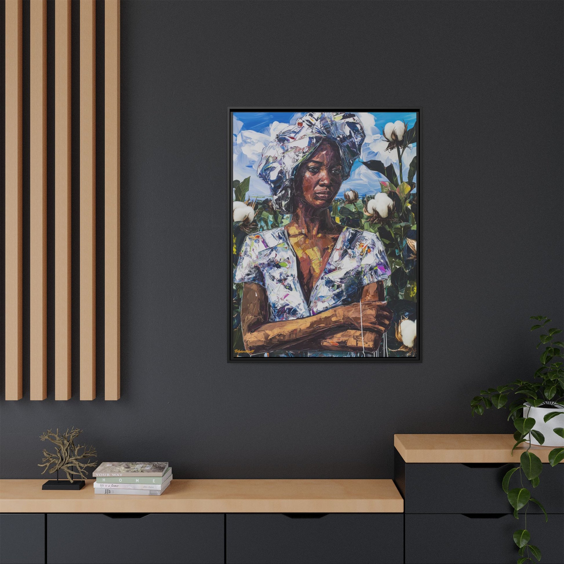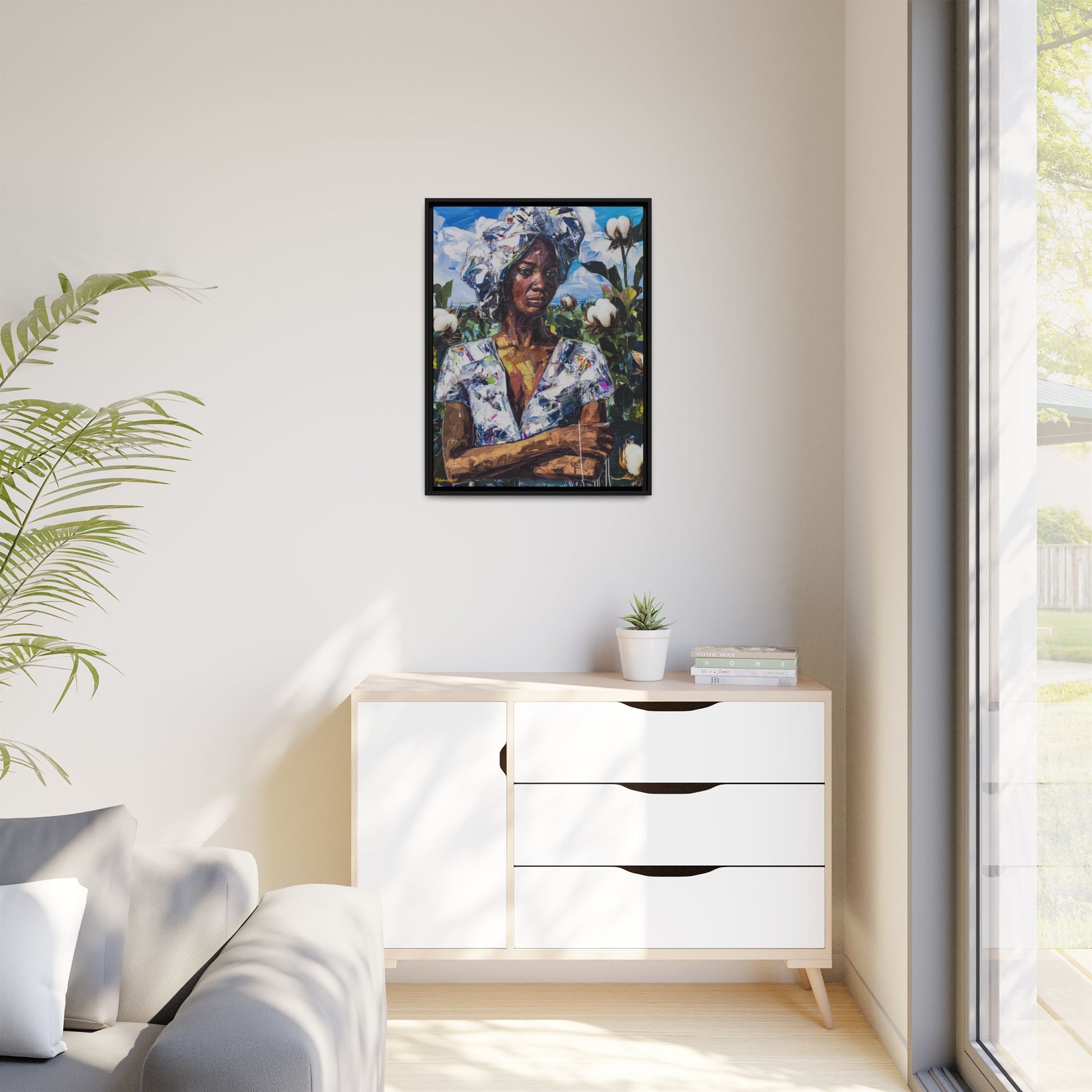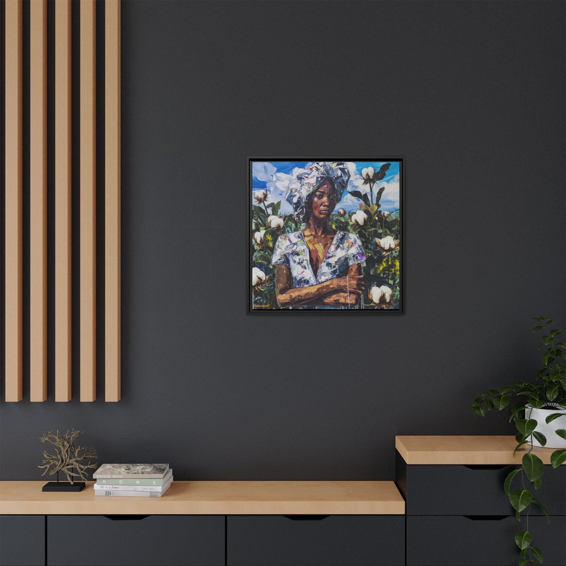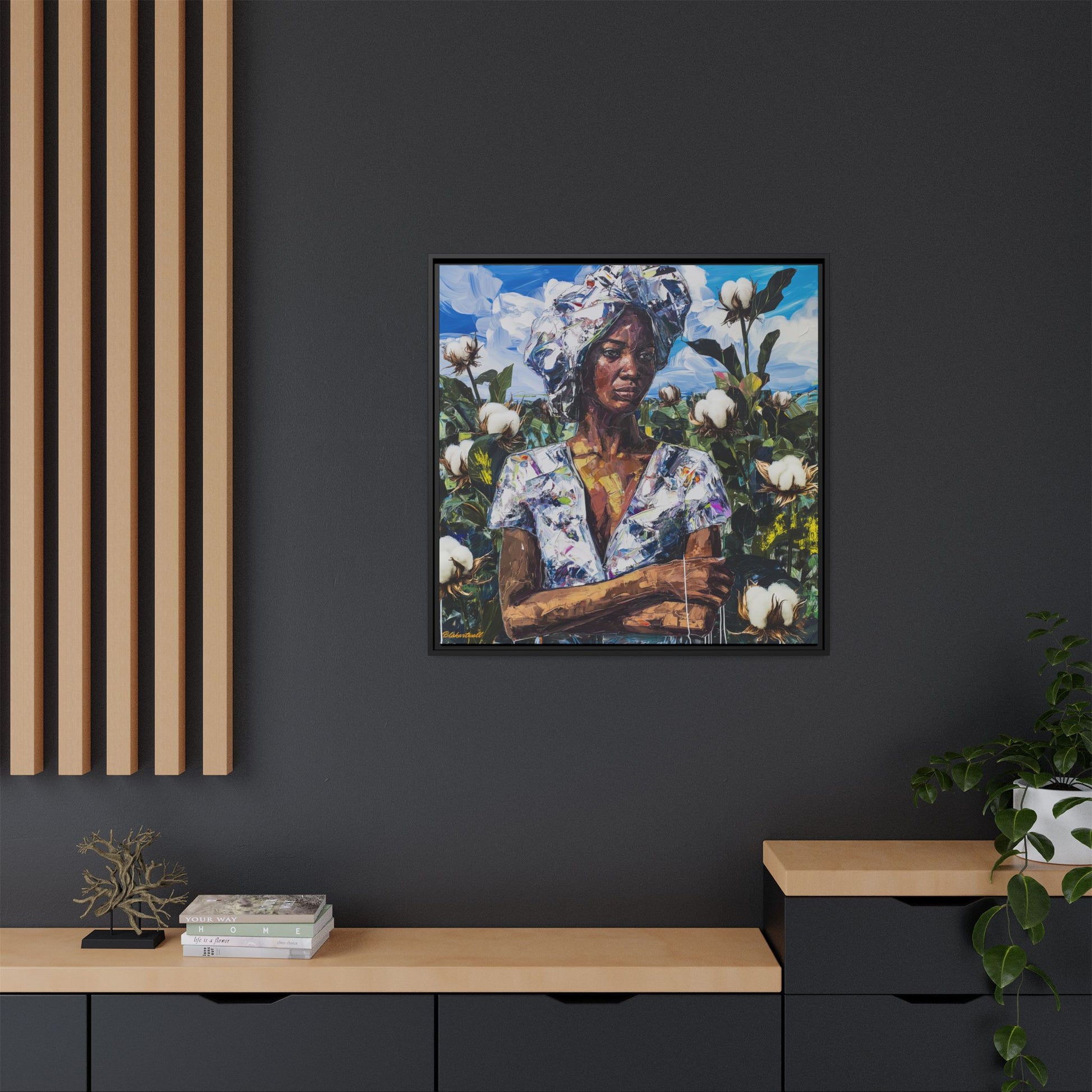 COTTON BLOOM: RESILIENCE IN NATURE. It features a woman amidst cotton plants, symbolizing growth, natural beauty, and the enduring strength found both in nature and the human spirit, particularly resonant with themes of African heritage and femininity.