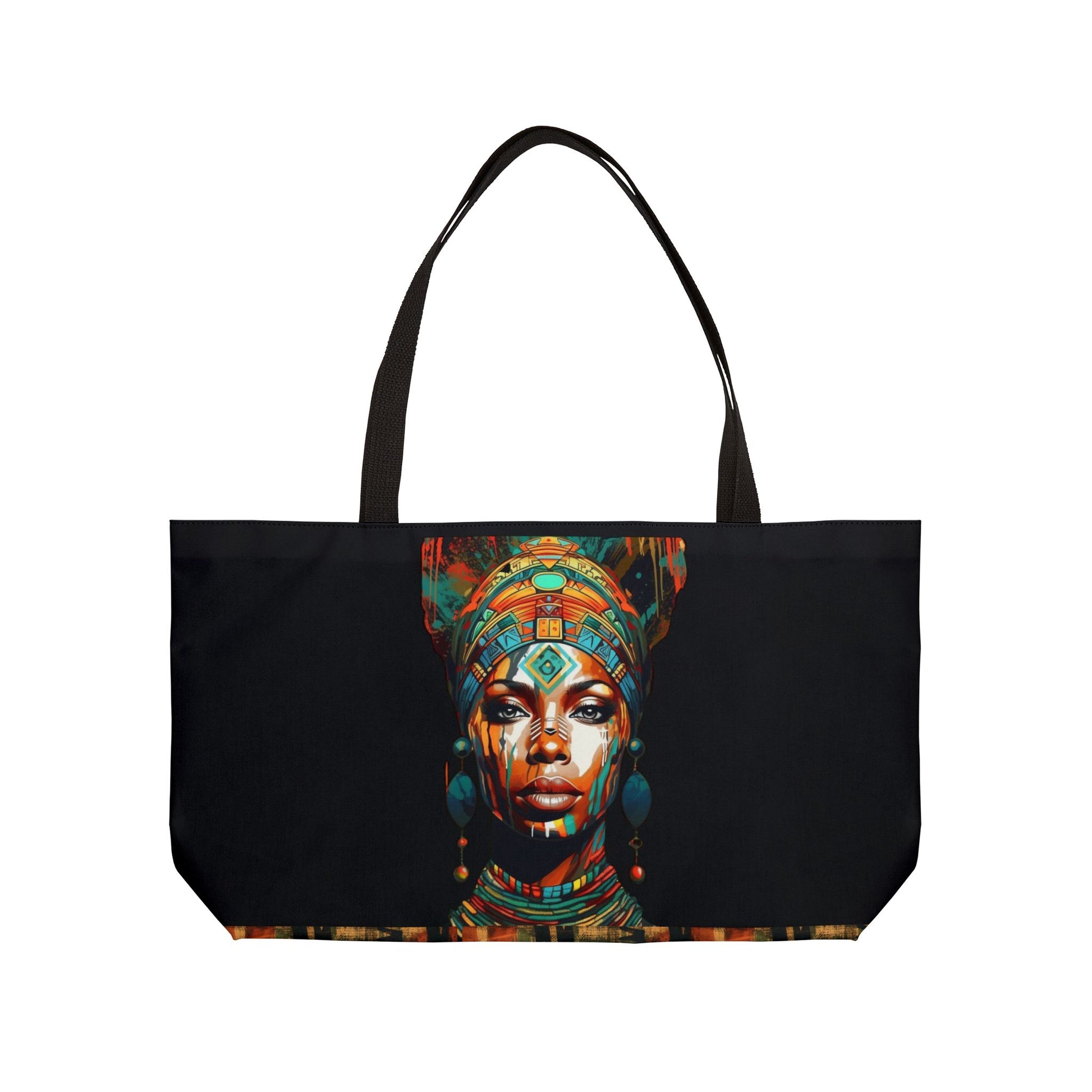 Carry a piece of art wherever you go with the "Regal Gaze Queen Weekender." This elegant bag showcases a powerful portrait of a figure in traditional regalia, whose gaze radiates strength and wisdom. Set against a vivid, warm color palette, it highlights the depth of African culture. Perfect for a day at the beach or a quick shopping spree, it combines functionality with cultural expression.