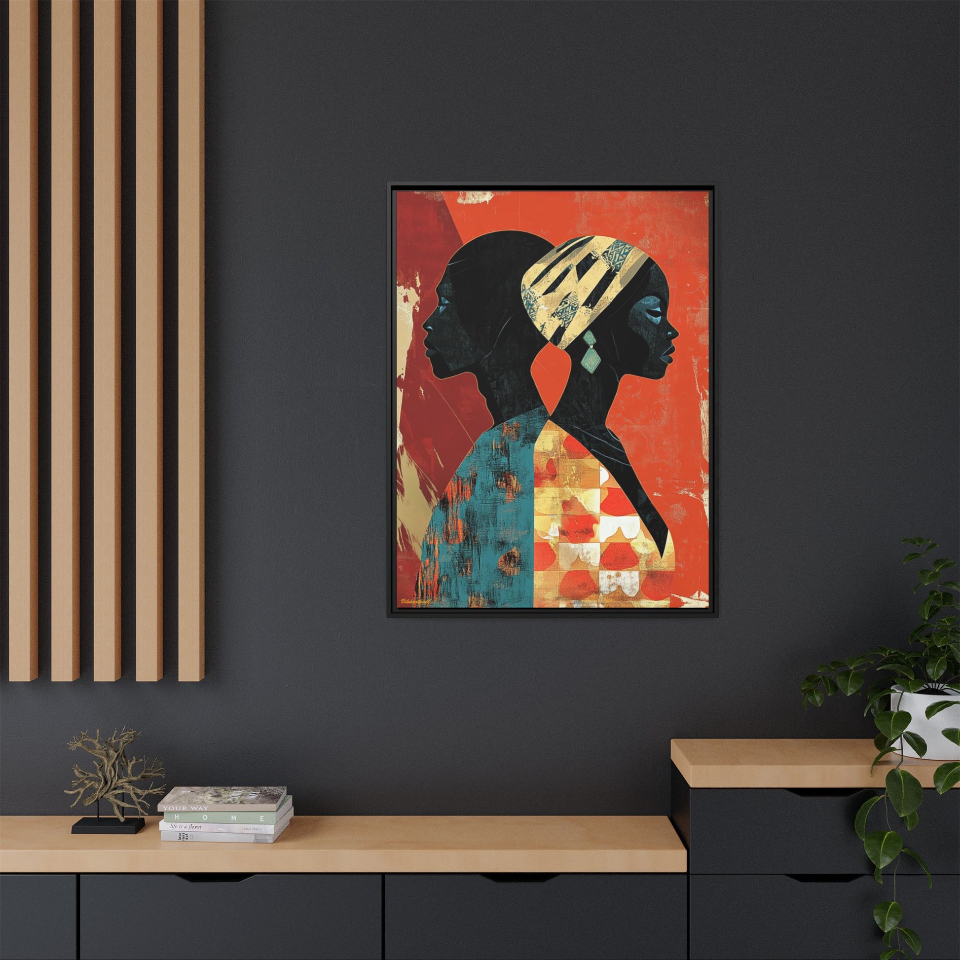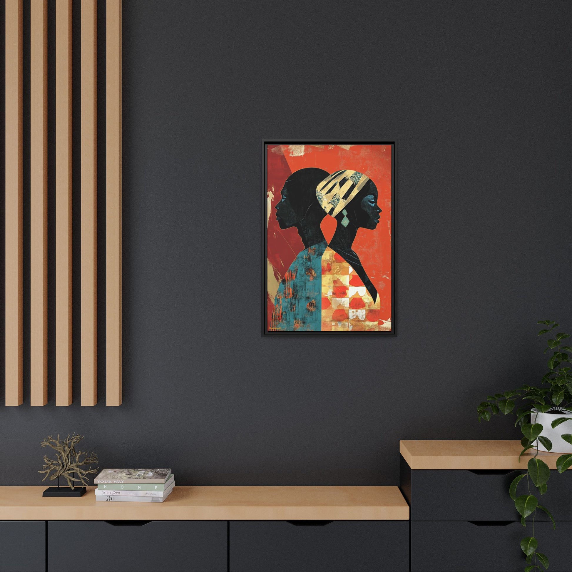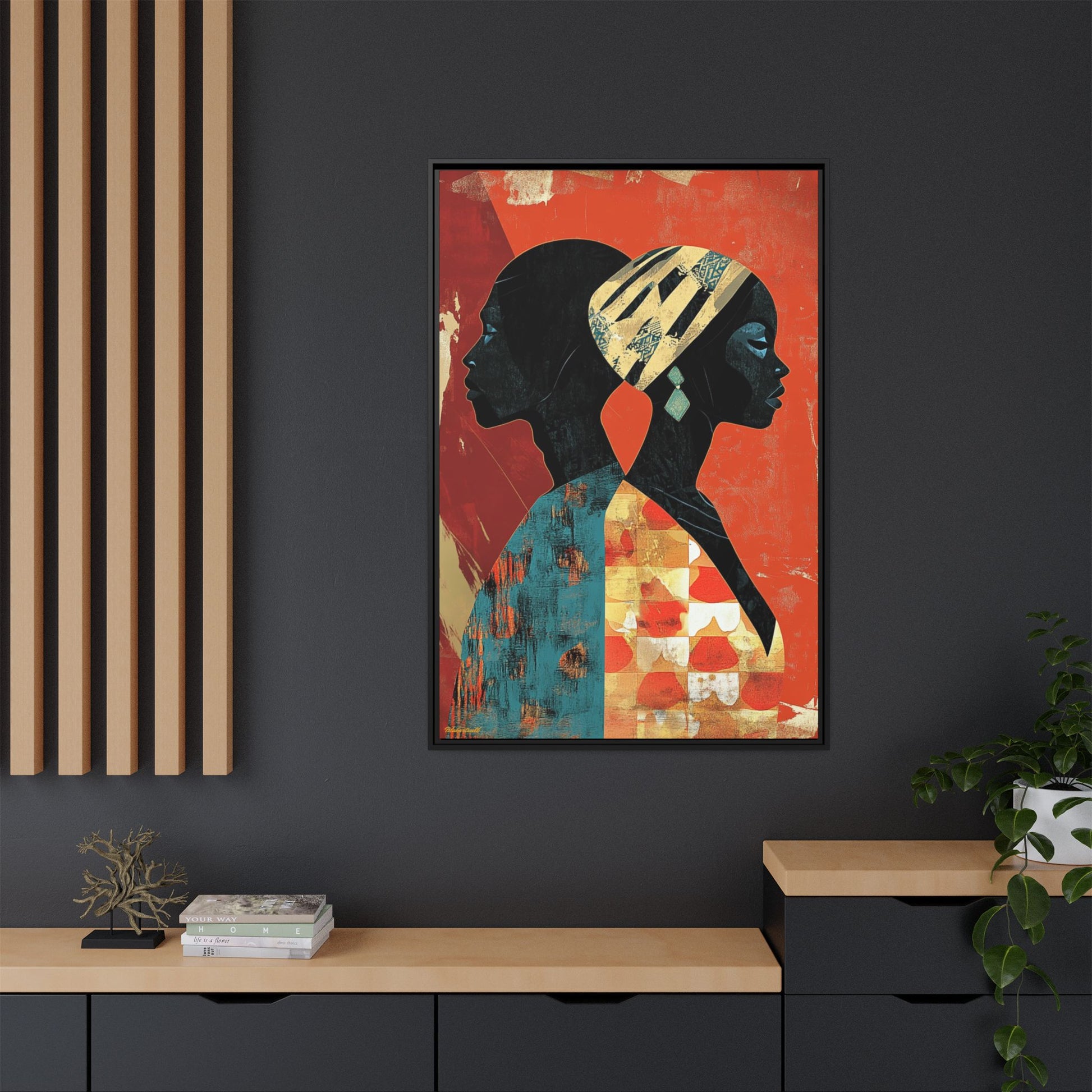 CULTURAL REFLECTIONS Mirroring each other with a shared cultural palette, these faces celebrate African artistic legacy, painted against a backdrop that tells of tradition and transformation.