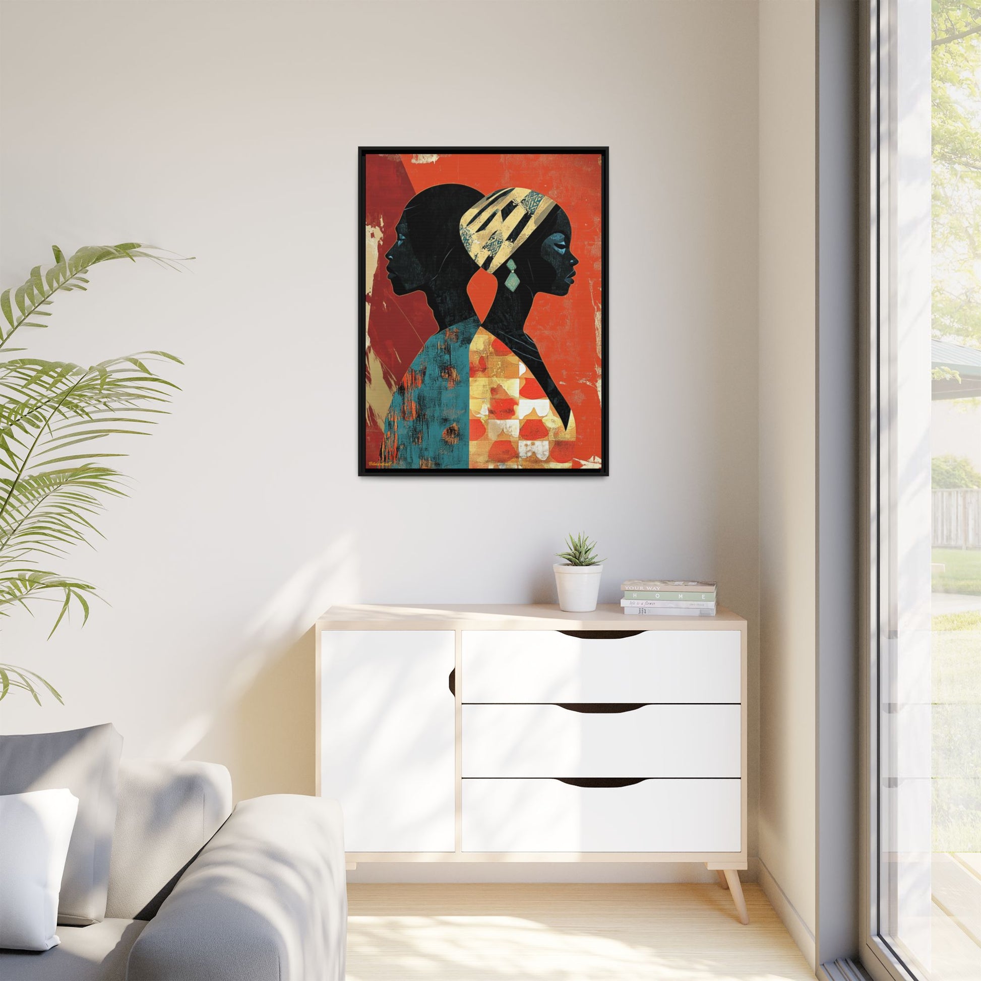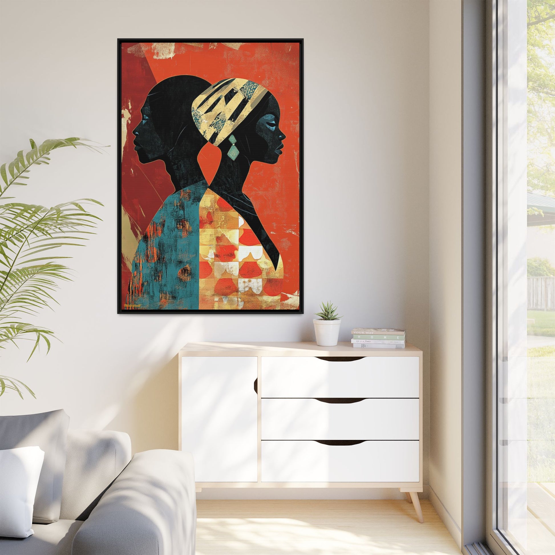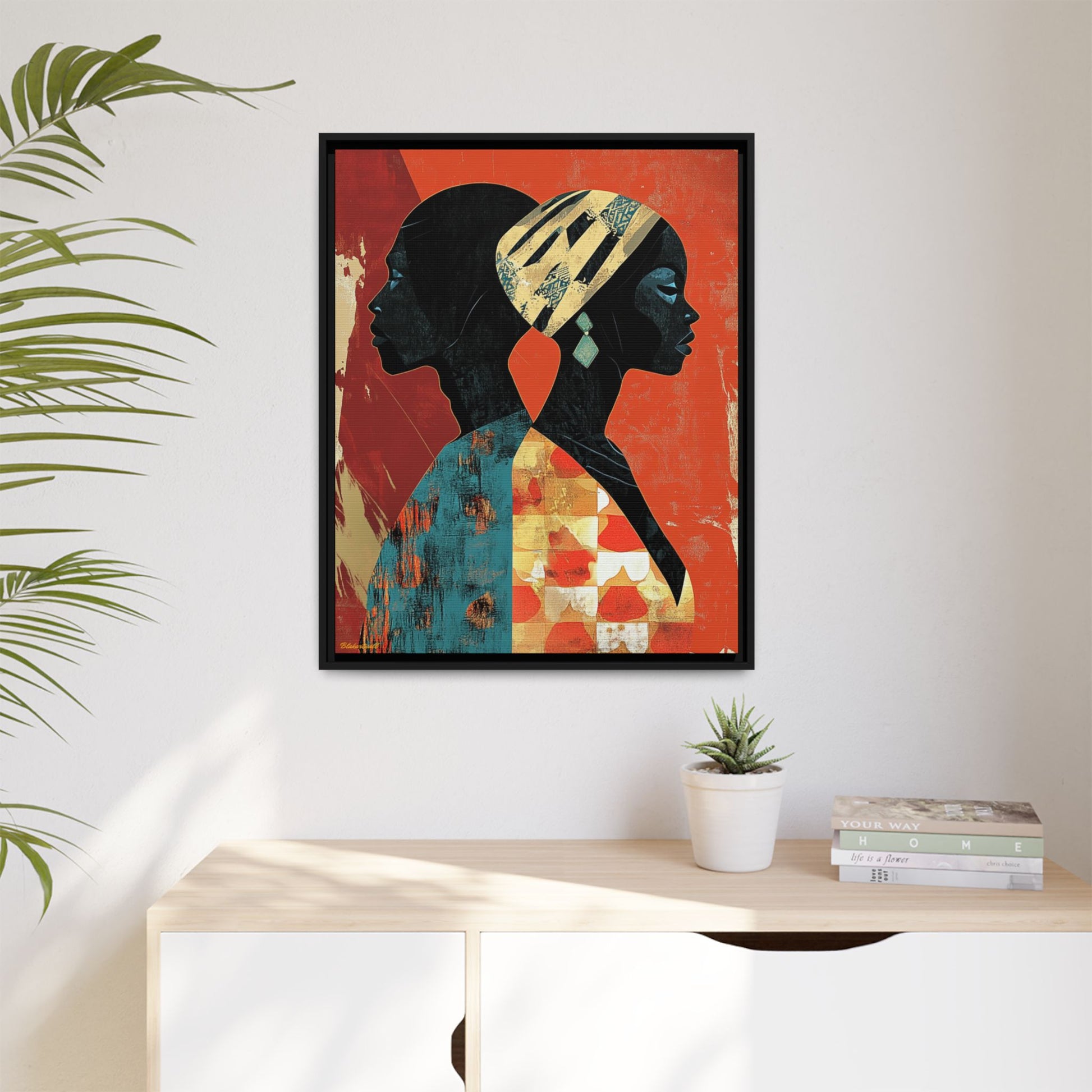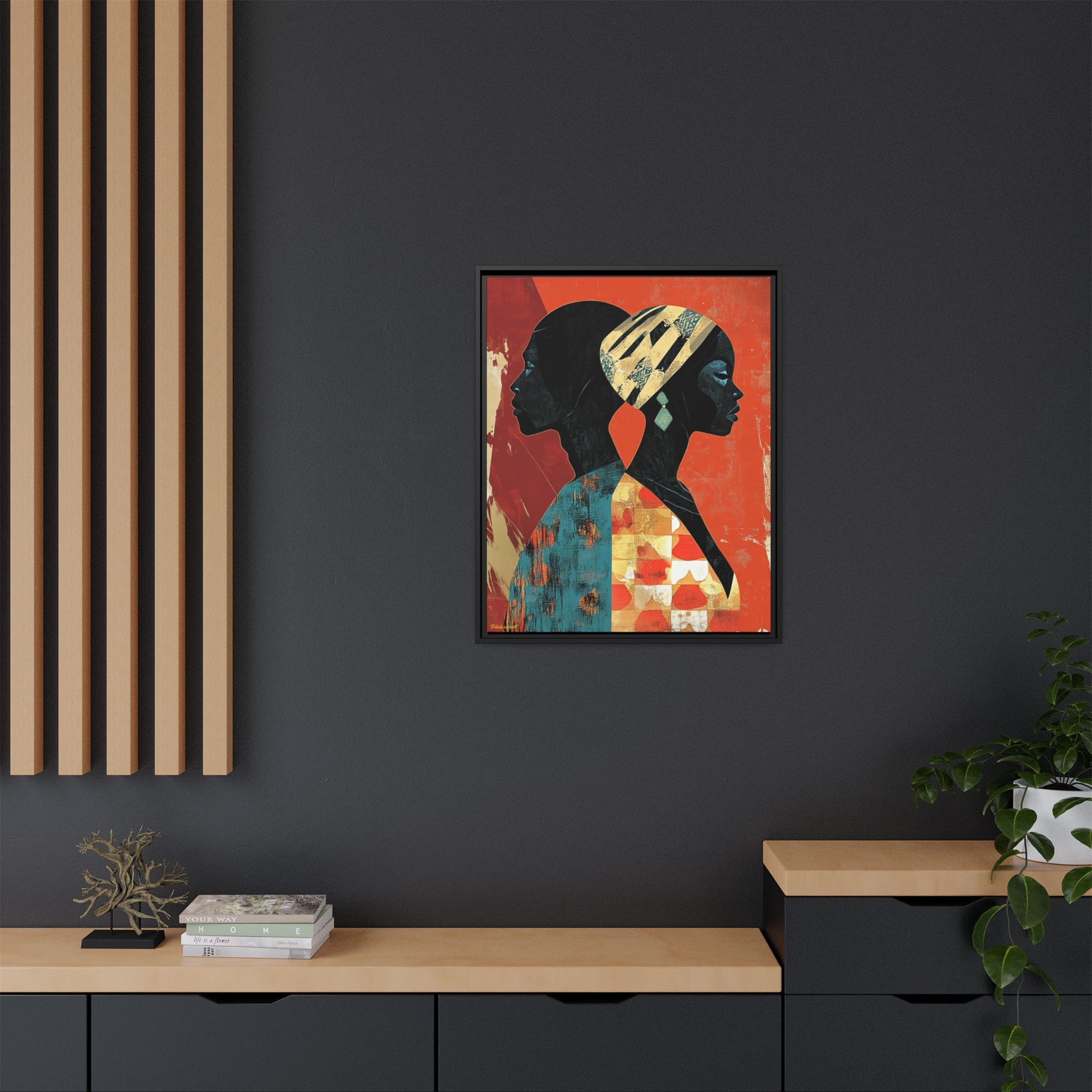 CULTURAL REFLECTIONS Mirroring each other with a shared cultural palette, these faces celebrate African artistic legacy, painted against a backdrop that tells of tradition and transformation.
