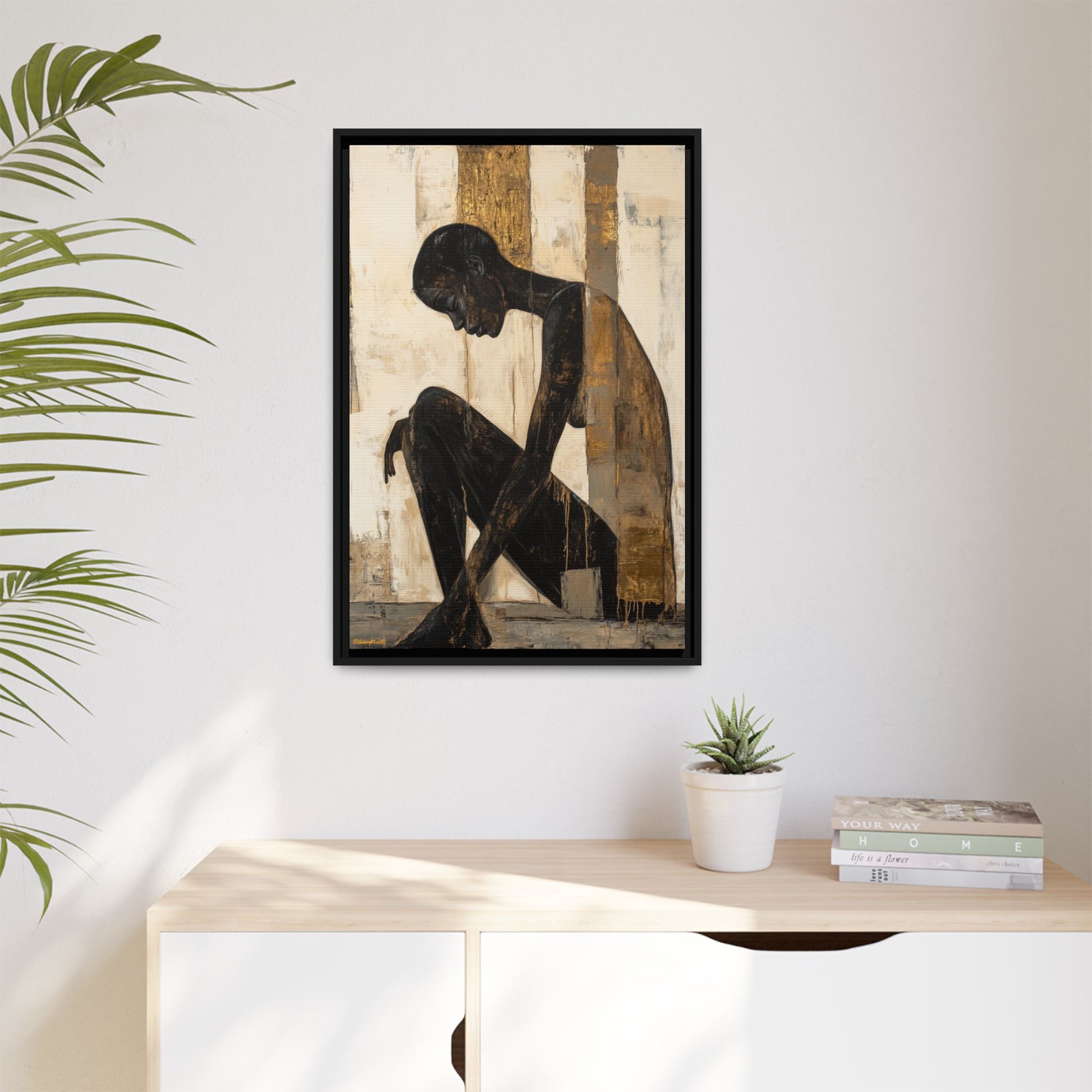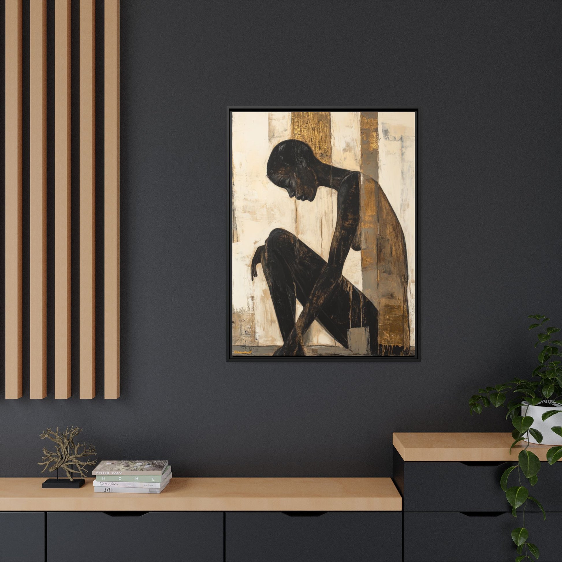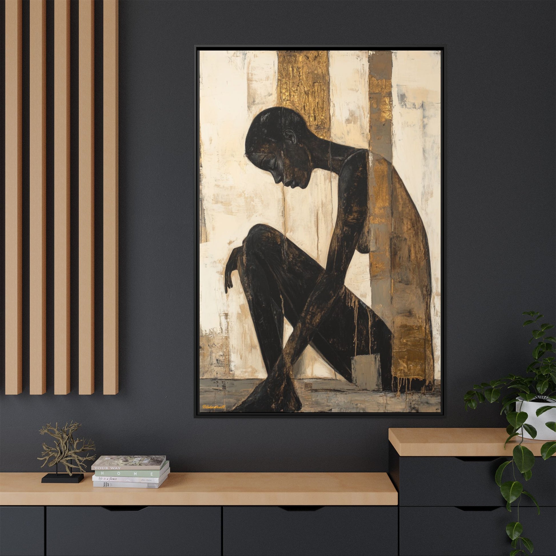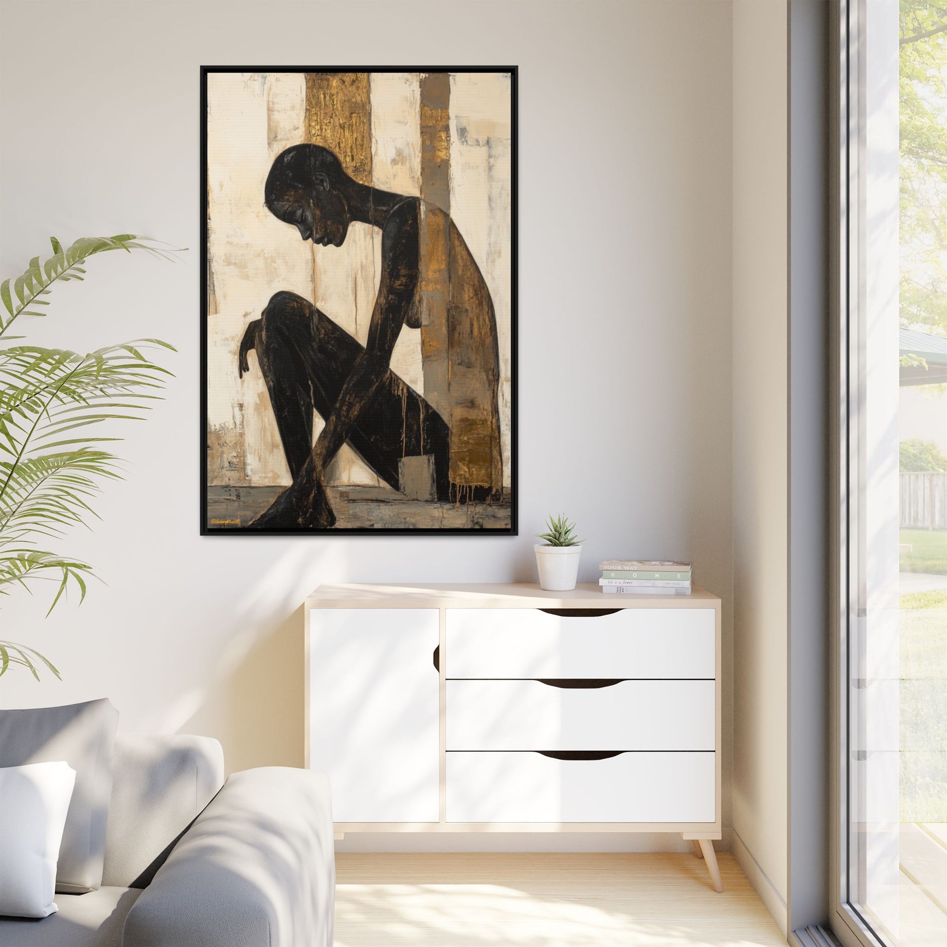 THE THINKER'S REPRIEVE: Cast in shadow against a fragmented golden canvas, this modern thinker's reprieve captures the quiet moments of reflection amidst the storms of life.